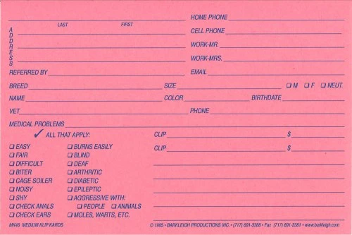These 4″x6″ cards offer space for pet description, medical problems, referral info, birth date, vet phone number and clip description. The popular Pet Profile Checklist saves time and records valuable pet information. Back of card has columns for date, services, charges, and reminder date.