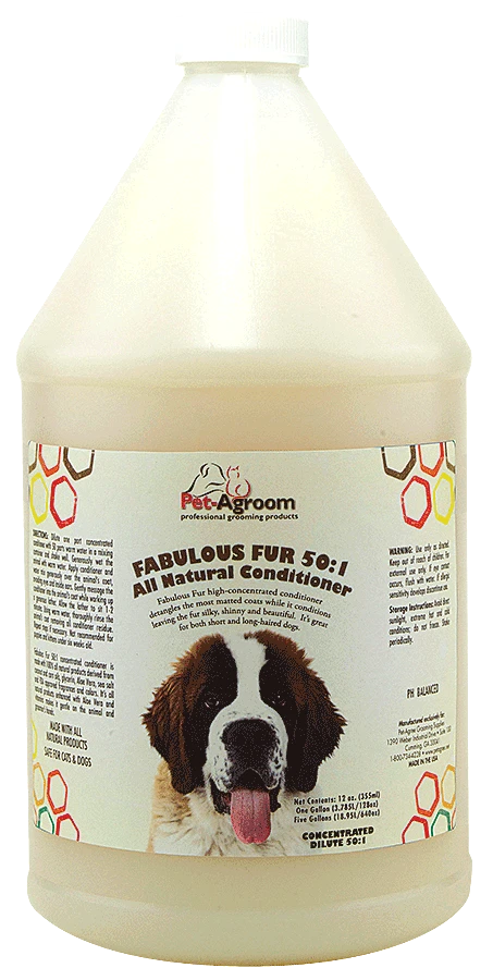 Pet Agroom’s Fabulous Fur Conditioner 50:1 A premium, highly concentrated conditioner with all natural products, including Aloe Vera, helps detangle and condition the most difficult coats. It conditions effectively and gently while leaving your pet looking and smelling great for days.