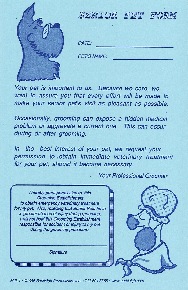 Pet release forms explain, in a gentle way, the owner’s responsibility to the groomer and give the groomer the right to obtain emergency treatment for their pet. Forms come in pads of 50 forms. Choose from Senior Pet, Fuzzy (matted) Pets, or General.