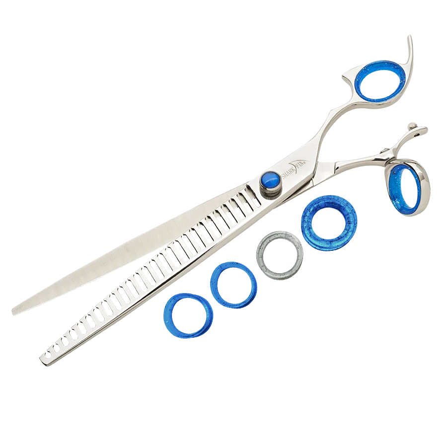 NEW GREAT WHITE Texture shears are forged from the finest authentic 440-C Japanese steel. Amazing for blending! Unbelievable for poodles, bichons, golden retrievers, golden doodles and all other breeds that have curly coats… for all your blending needs from breeds A to Z… eliminates all hard lines when texturizing. They have a Rockwell hardness of 57-58.